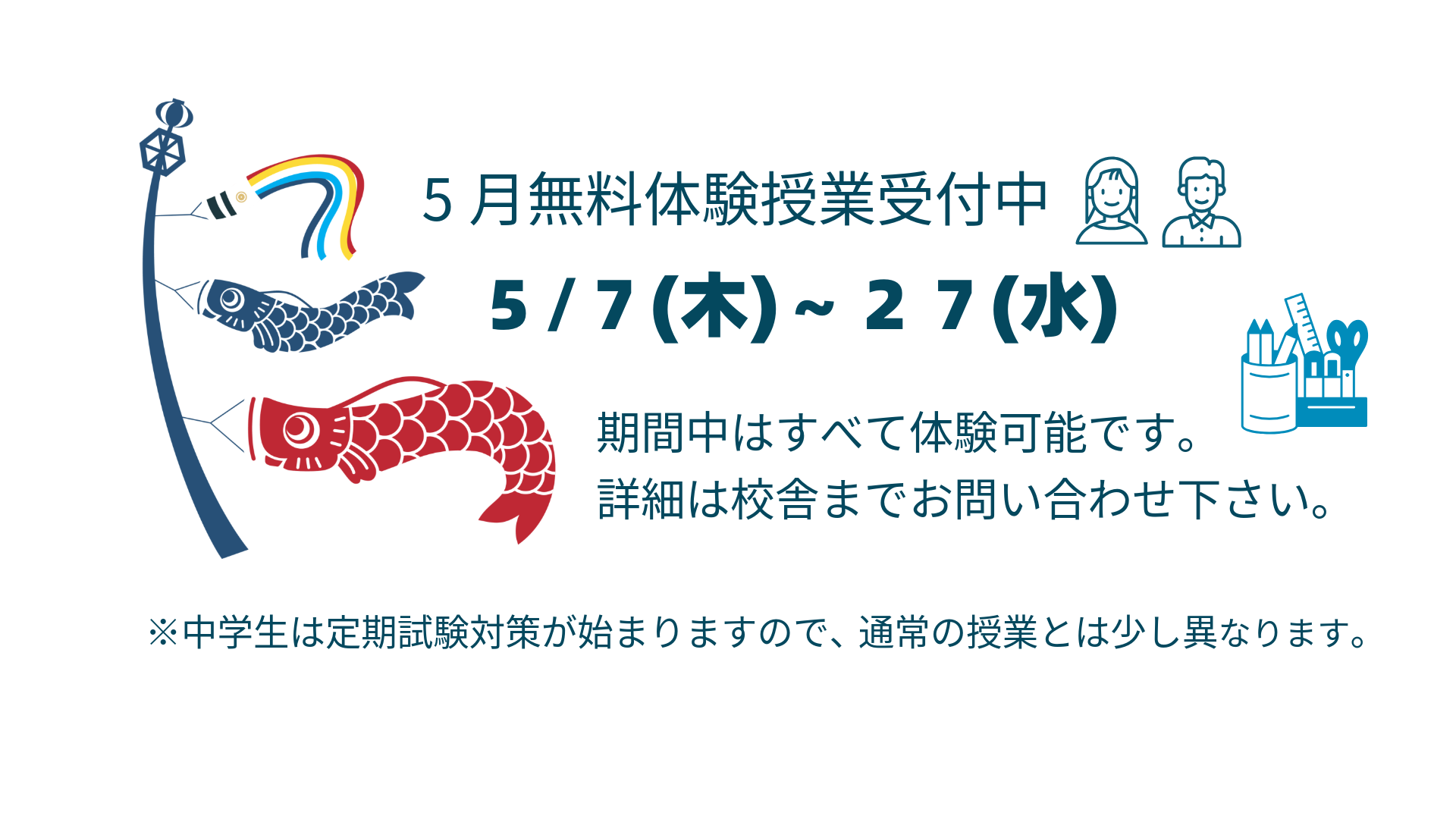 知識が増加すると、考え方が変わります。思考の方法が変化すると、未来への選択肢が増え可能性が広がるのではないでしょうか。その一翼を担うべく、講師・生徒・保護者がスクラムを組み、3人4脚でその可能性の構築をしていきたいと考えております。そのためには、お子様に正しい学習習慣を身につけさせることが重要と考えております。地域密着ならではの定期テスト対策や入試対策をはじめ、さまざまな指導を行っておりますので、興味をお持ちの方は来校していただき、お話をさせていただければと思います。