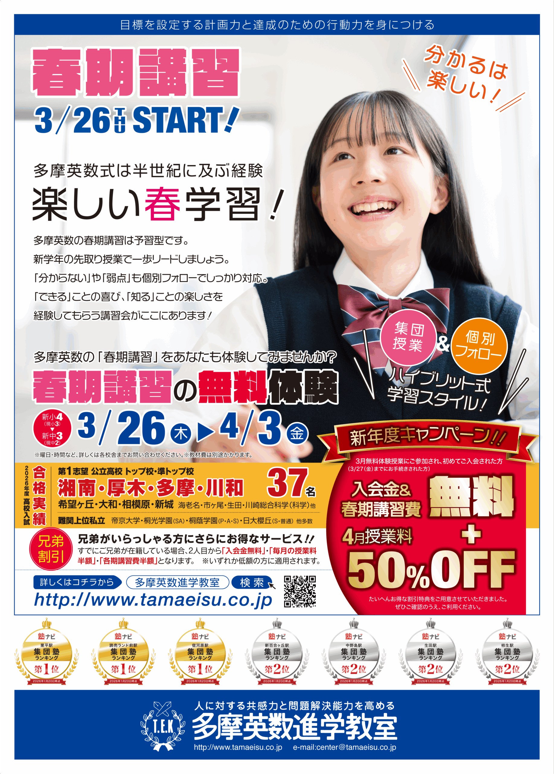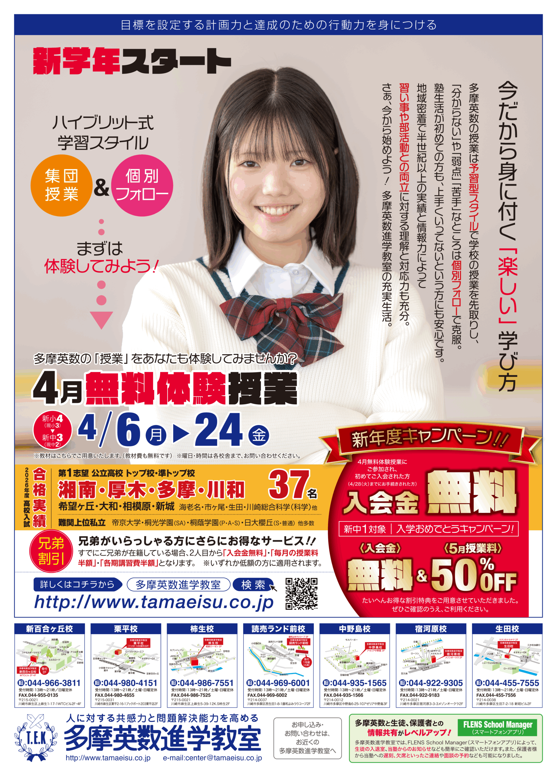 こんにちは!多摩英数進学教室読売ランド前校では、日々の授業の中で、学力の向上を目指すだけではなく、立派な人間として自分の力で生きていけるよう、生徒・スタッフともに成長しながら充実した生活を送っています。「志望校合格」という目標はその一つに過ぎません。大切なことは、「努力は必ず報われる」という経験を通じ、その先の長い人生に出くわすであろう困難を乗り越える力を養うことであると私は考えます。「未来の自分」に誇れる自分になるために…いっしょにがんばりましょう!